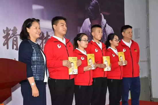 付俊、徐碚向?qū)W生代表贈予書籍,卜玉龍向?qū)W生代表授予“保利星火班”旗幟。