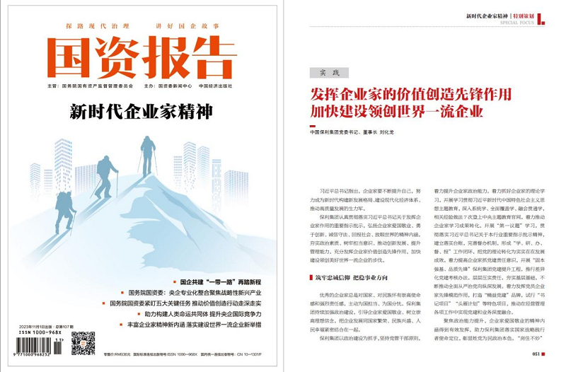 近日,《國資報告》雜志刊發(fā)保利集團黨委書記、董事長劉化龍署名文章《發(fā)揮企業(yè)家的價值創(chuàng)造先鋒作用 加快建設領創(chuàng)世界一流企業(yè)》。文章聚焦保利集團以政治建設、深化改革、體系搭建、完善治理體系為抓手,進一步發(fā)揮好企業(yè)家頭雁作用,堅定當好高質量發(fā)展執(zhí)行者、行動派、實干家的成果成效。