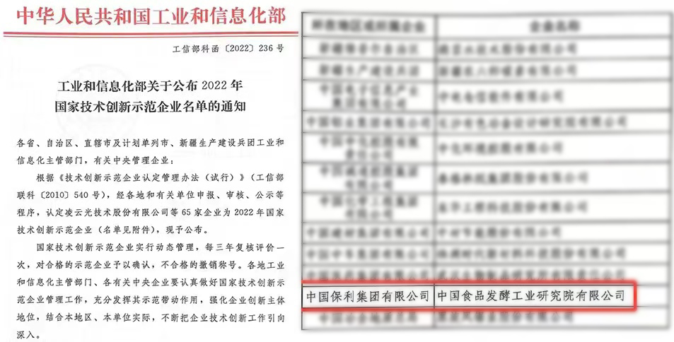 保利中輕下屬中國食品發(fā)酵工業(yè)研究院被工業(yè)和信息化部認(rèn)定為2022年“國家技術(shù)創(chuàng)新示范企業(yè)”