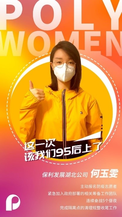 Facing the forbidding battle against the epidemic, He Yuwen, a post-95s girl working in a company in Hubei subordinated to Poly Developments and Holdings Group Co., Ltd., signed up for volunteers to join the work team deployed by the government. She fought continuously and round-the-clock for five days and nights to complete the clean-up of an isolation point.