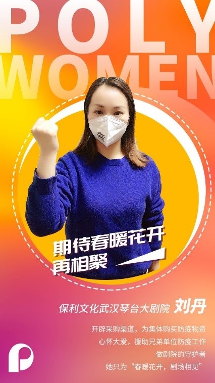 Liu Dan, working in Wuhan Qintai Grand Theatre of Poly Culture Group Co., Ltd., opened up procurement channels to purchase epidemic prevention materials for the company. With great love, she also assisted other companies and subsidiaries in epidemic prevention. As the guardian of the theater, she believes that when “flowers bloom in spring, we will meet again at the theater”.